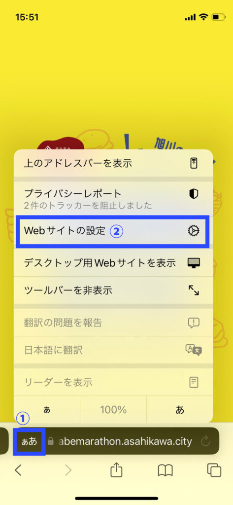 1.ウェブサイトを開いた状態で、URLを入力する部分の一番左にある①の「ぁあ」を押し、②の「Webサイトの設定」を選択します。
