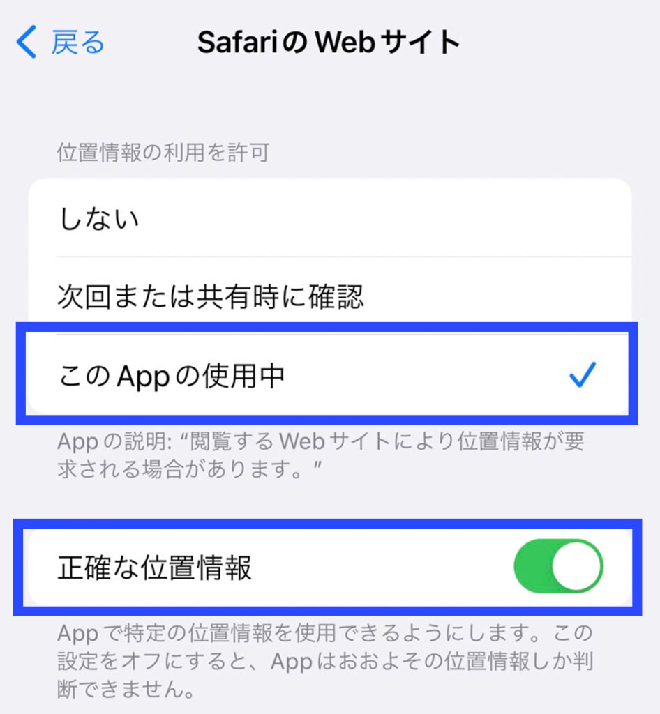 5.「このAppの使用中」が選択され、「正確な位置情報」が「オン」になっていることを確認してください。なっていない場合は変更してください。